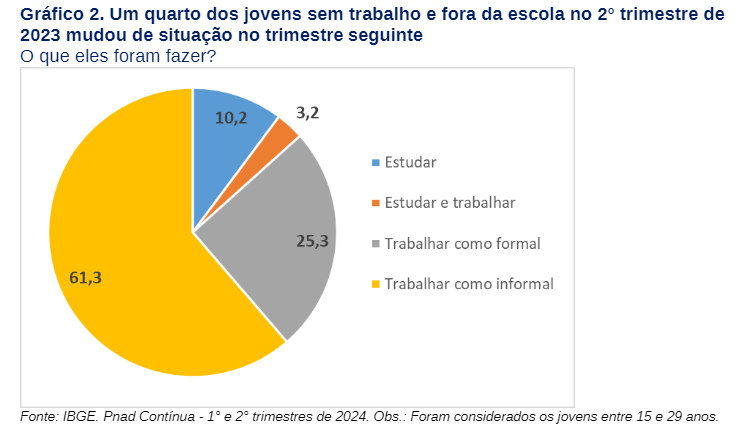 Cerca de um quarto (27%) dos jovens considerados nem-nem no primeiro trimestre de 2024 não estavam mais nessa situação no trimestre seguinte, a maioria porque começou a trabalhar (Gráfico 2). Se levado em conta um período maior, 39% dos jovens que estavam sem trabalho e fora da escola no segundo trimestre de 2023 haviam mudado de situação um ano depois.